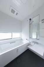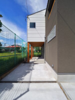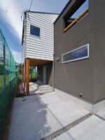 工務店依頼案件でローコストながらも、敷地の特性を生かし、道路側に壁で囲われた大きなルーフバルコニーを設置することで、道路前面の公園からの視線を遮り、プライバシーに配慮しました。