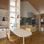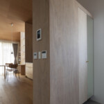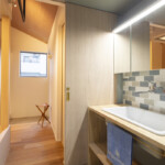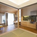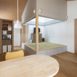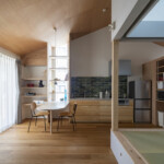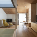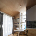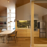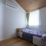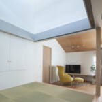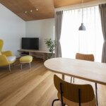 平屋に建て替えるにあたり、2階建てだった以前の建物より、更に日射を取り入れることが難しくなると想定される中で、住宅の中心に高所窓を設置した吹き抜け(光井戸)を計画することで、室内全体に日射を取り入れ、明るい空間を実現しています。