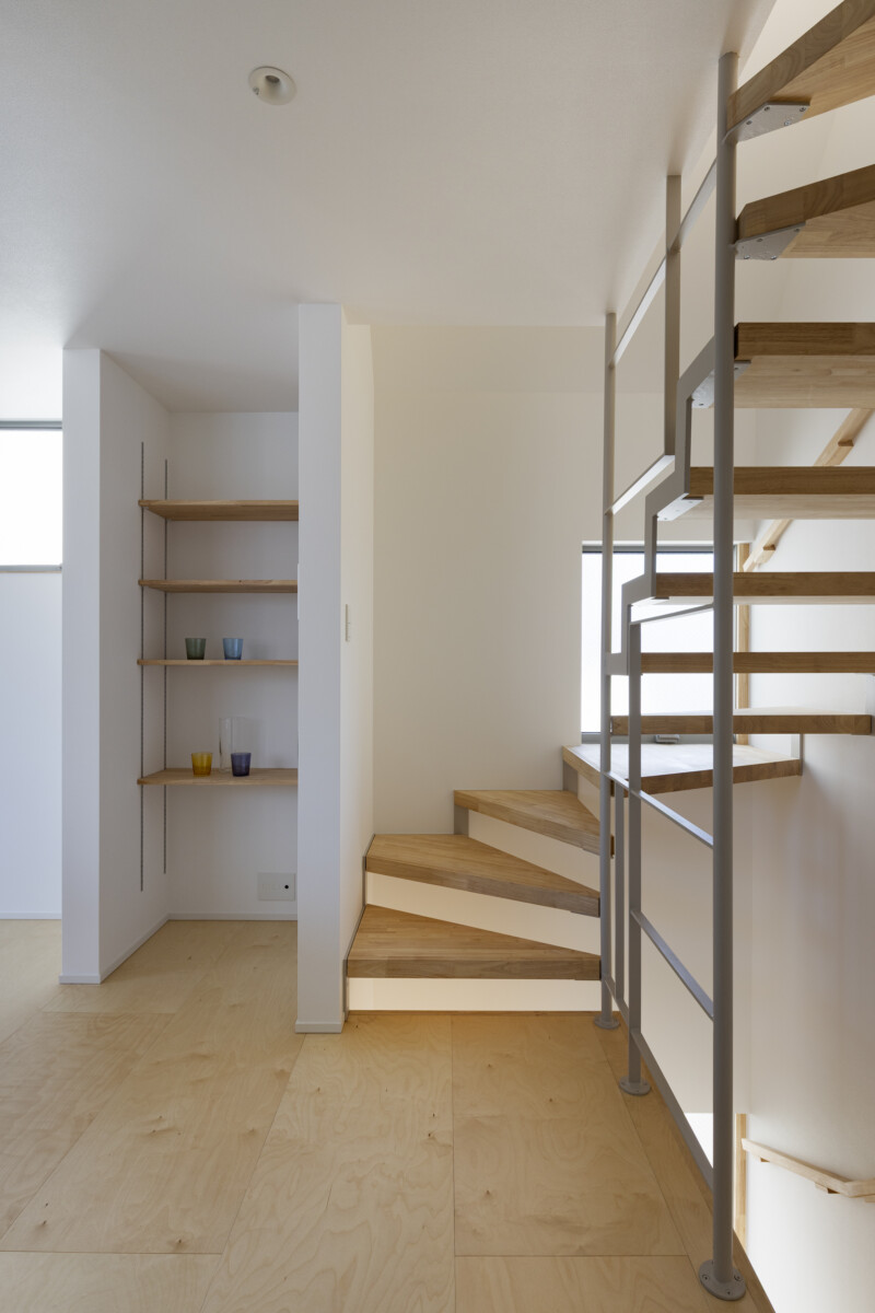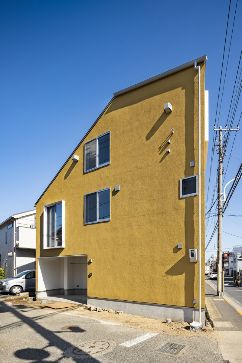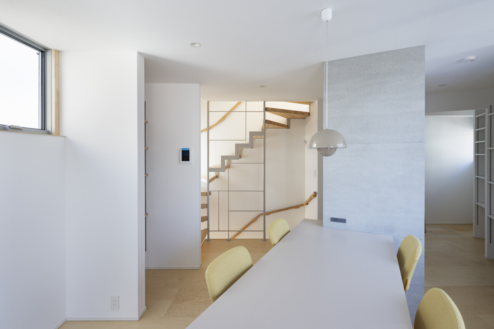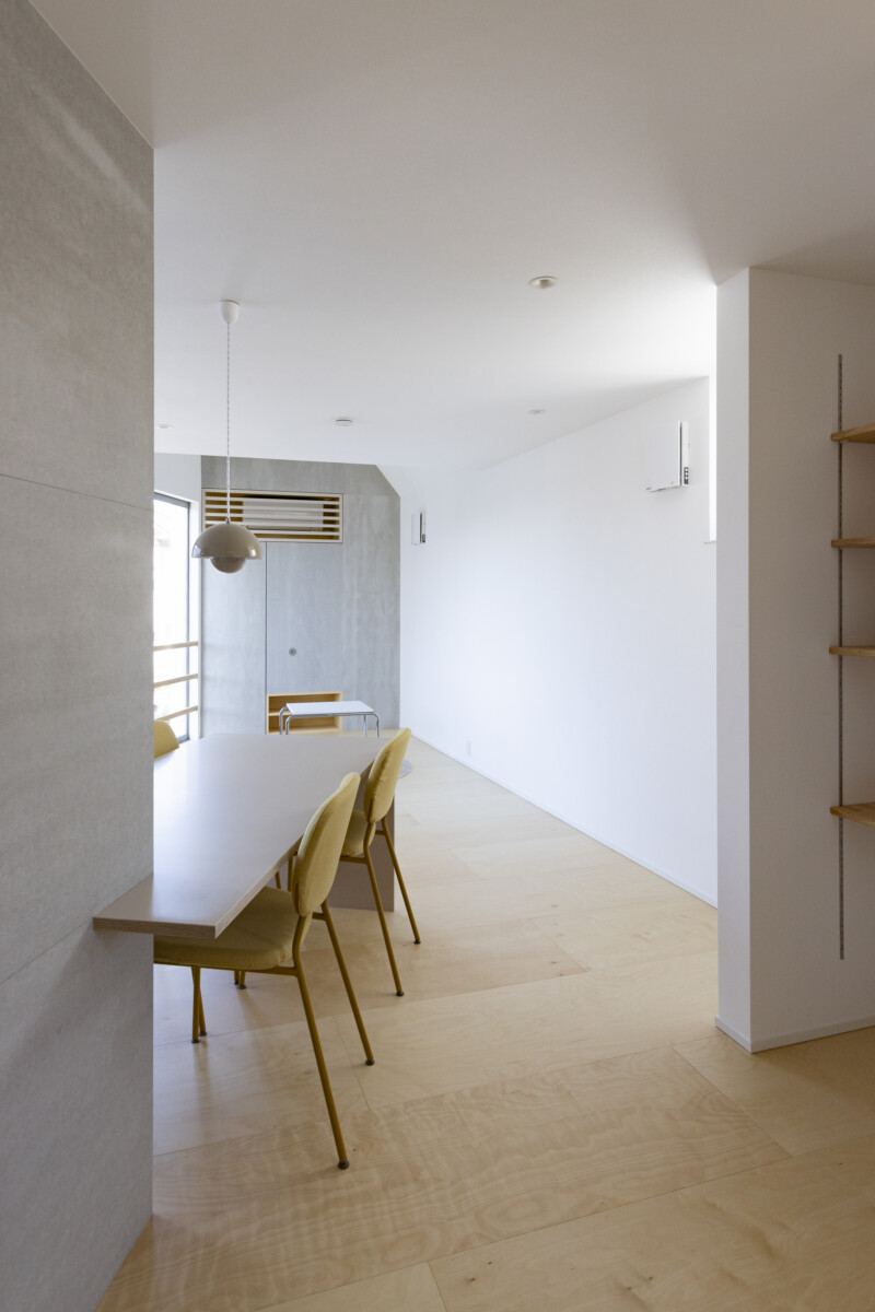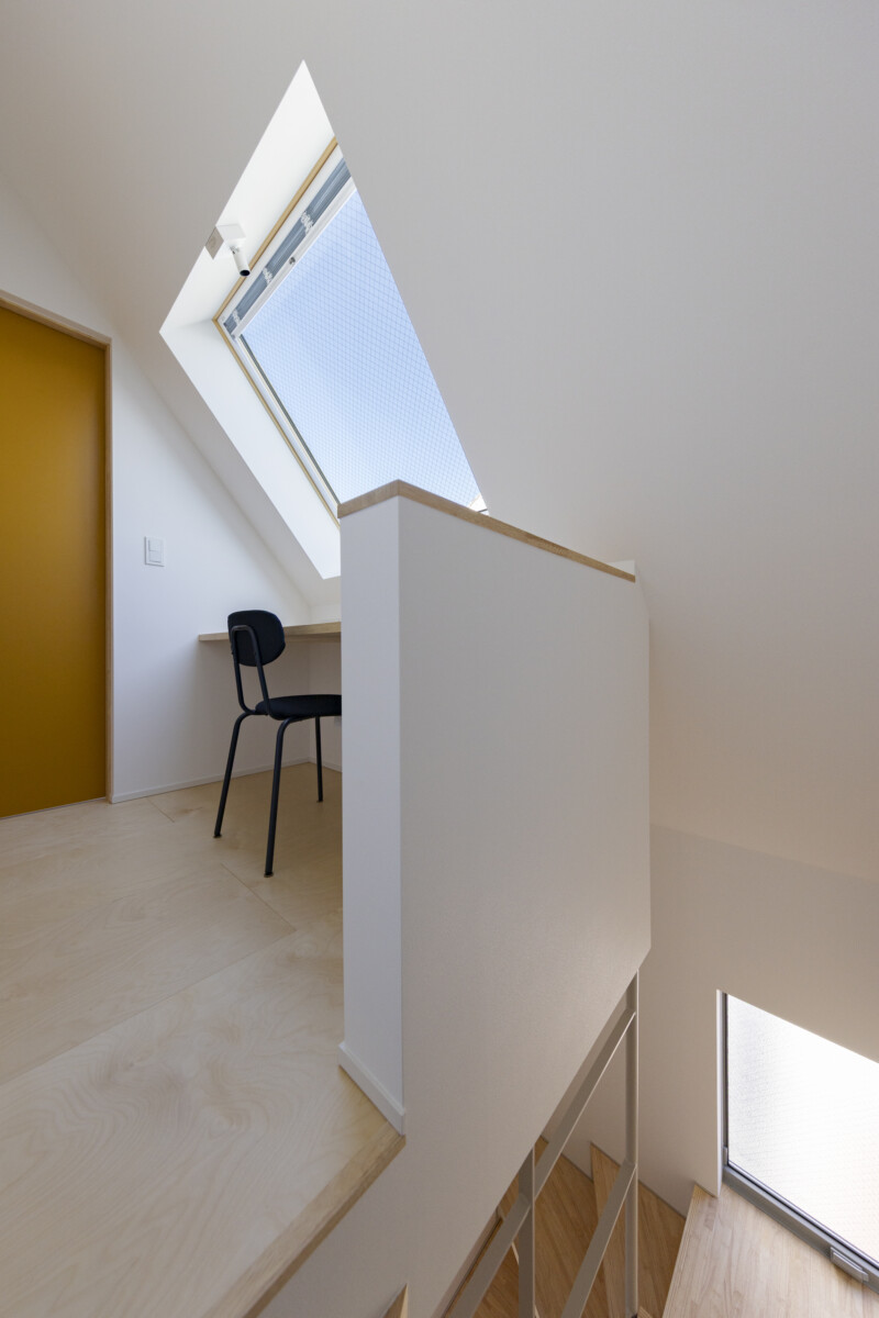 厳しい高さ制限や容積率の中で必要な面積を確保するために、各階のボリュームを丁寧に整理し、光の入り方や風の通り方を細やかに整えています。台形の広がる部分と絞られる部分を積極的に空間へ取り込み、場所ごとに異なる奥行きと視線の抜けをつくることで、限られた面積でも広がりを感じられる構成としました。