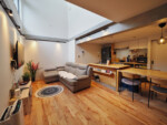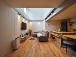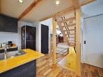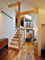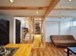 親世帯は地下リビングではありますが、大きな吹抜があり、地下を感じさせない明るい空間となっています。子世帯のリビングは2階に配置し、リビングからスタディーコーナー、小屋裏収納までスキップフロアで繋がり、広く感じる開放的な空間としています。